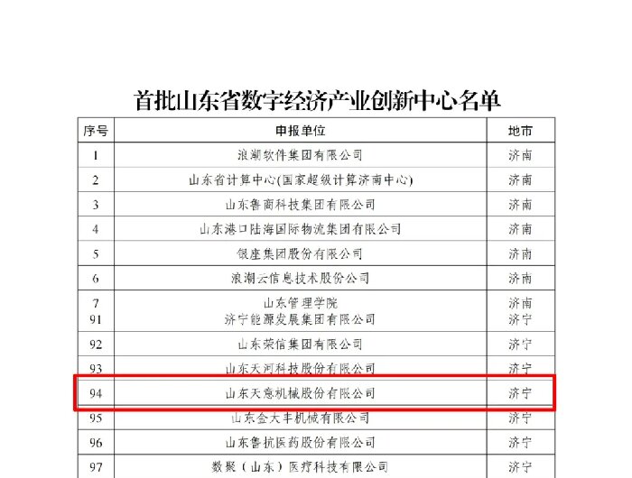 近日,省工信廳公布了首批山東省數(shù)字經(jīng)濟(jì)創(chuàng)新平臺名單,天意機(jī)械入選首批數(shù)字經(jīng)濟(jì)產(chǎn)業(yè)創(chuàng)新中心公示名單。