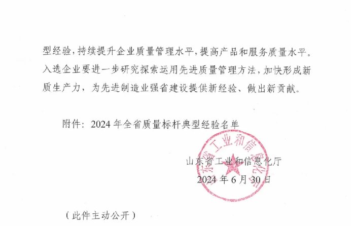 全省質(zhì)量標桿是由山東省工信廳主導,山東省質(zhì)量協(xié)會組織評選的省級榮譽,旨在強化提升企業(yè)質(zhì)量管理水平,推動培育和建設產(chǎn)品卓越、品牌卓越、創(chuàng)新領(lǐng)先、治理現(xiàn)代、具有核心競爭力的一流企業(yè),代表各行業(yè)、各領(lǐng)域的優(yōu)秀質(zhì)量示范。2024年主要聚焦質(zhì)量管理體系升級、關(guān)鍵過程質(zhì)量控制、產(chǎn)業(yè)鏈供應鏈韌性與安全和質(zhì)量管理數(shù)字化進行遴選。