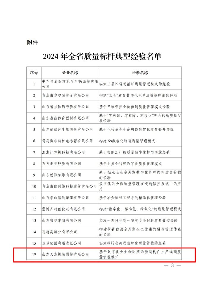 近日,山東省工業(yè)和信息化廳公布了全省質(zhì)量標桿獎。天意機械憑借在關(guān)鍵過程質(zhì)量控制方向的不懈探索,以基于數(shù)字化全生命周期的預制構(gòu)件生產(chǎn)線高質(zhì)量管理模式斬獲“2024年全省質(zhì)量標桿”。