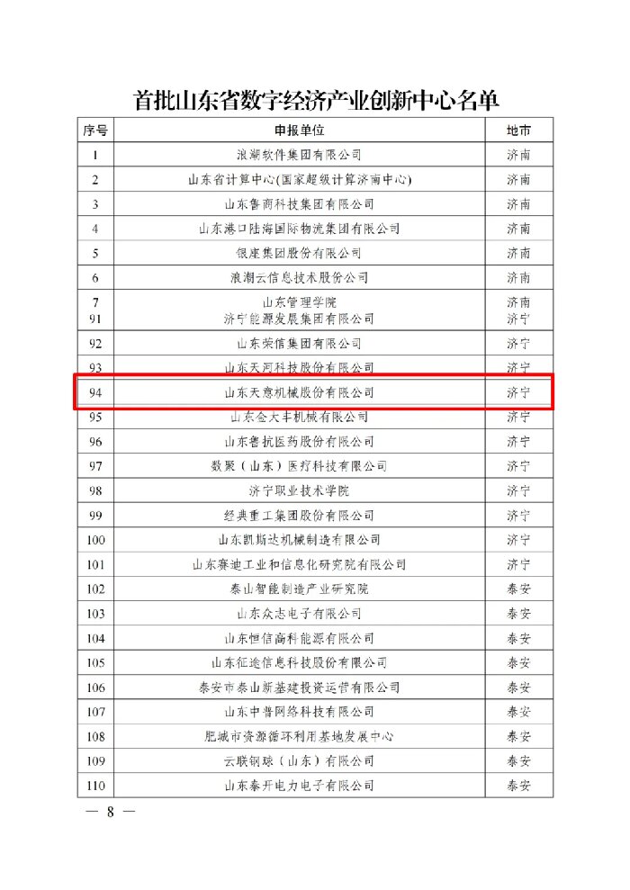 6月,省工信廳公布了首批山東省數(shù)字經(jīng)濟(jì)創(chuàng)新平臺名單,天意機(jī)械入選首批數(shù)字經(jīng)濟(jì)產(chǎn)業(yè)創(chuàng)新中心名單。