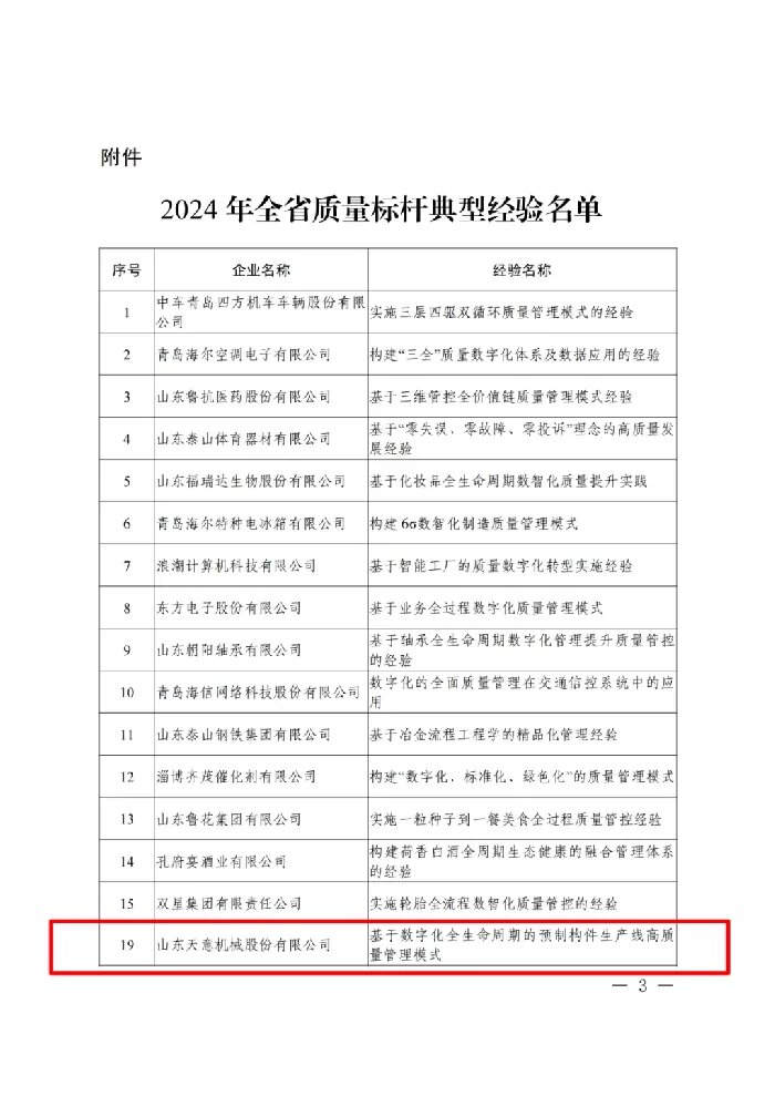 7月,山東省工業(yè)和信息化廳公布了全省質(zhì)量標(biāo)桿獎。天意機(jī)械憑借在關(guān)鍵過程質(zhì)量控制方向的不懈探索,以基于數(shù)字化全生命周期的預(yù)制構(gòu)件生產(chǎn)線高質(zhì)量管理模式斬獲“2024年全省質(zhì)量標(biāo)桿”。