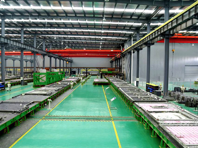 PC環(huán)形疊合板生產(chǎn)線采用高精度、高結(jié)構(gòu)強(qiáng)度的成型模具,經(jīng)自動布料機(jī)把混凝土澆筑其中、振動臺振搗后并不立即脫模,而是經(jīng)預(yù)養(yǎng)護(hù)、蒸汽養(yǎng)護(hù),使構(gòu)件強(qiáng)度滿足設(shè)計(jì)強(qiáng)度時(shí)才進(jìn)行拆模處理,拆模后的成品構(gòu)件運(yùn)輸至成品暫存區(qū)或室外堆場,而空模臺沿輸送線自動返回,形成自動化環(huán)形流水作業(yè)。