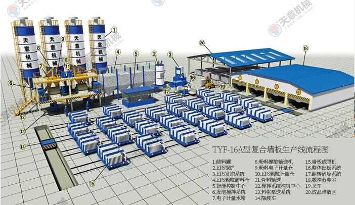 TYF-16A型復(fù)合墻板生產(chǎn)線是公司綜合國(guó)內(nèi)外技術(shù)經(jīng)驗(yàn),開發(fā)研制的新型墻體板材生產(chǎn)線。復(fù)合墻板生產(chǎn)線主要分為配料系統(tǒng)、攪拌系統(tǒng)、發(fā)泡系統(tǒng)、數(shù)控配電系統(tǒng)、墻板成型系統(tǒng)、料漿泵送系統(tǒng)、EPS預(yù)發(fā)系統(tǒng)、液壓循環(huán)系統(tǒng)、整體出板系統(tǒng)。